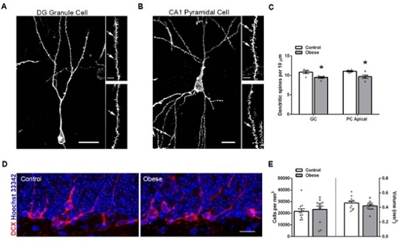 Elise Cope and colleagues replicated previous research by demonstrating diet-induced obesity in mice impairs performance on cognitive tasks dependent on the hippocampus and results in loss of dendritic spines — the neuronal protrusions that receive signals from other cells — and activates microglia. Using genetic and pharmacological approaches to block microglial activity, the researchers established microglia are causally linked to obesity-induced dendritic spine loss and cognitive decline. The results suggest obesity may drive microglia into a synapse-eating frenzy that contributes to the cognitive deficits observed in this condition.