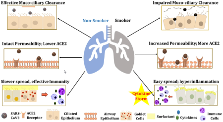 The current pandemic of COVID-19 has caused severe morbidity and mortality across the globe. People with a smoking history have severe disease outcomes by COVID-19 infection. Epidemiological studies show that old age and pre-existing disease conditions (hypertension and diabetes) result in severe disease outcome and mortality amongst COVID-19 patients. Evidences suggest that the S1 domain of the SARS-CoV-2 (causative agent of COVID-19) membrane spike has a high affinity towards the angiotensin-converting enzyme 2 (ACE2) receptor found on the host’s lung epithelium. Likewise, TMPRSS2 protease has been shown to be crucial for viral activation thus facilitating the viral engulfment. The viral entry has been shown to cause ‘cytokine storm’ involving excessive production of pro-inflammatory cytokines/chemokines including IL-6, TNF-α, IFN-γ, IL-2, IL-7, IP-10, MCP-3 or GM-CSF, which is augmented by smoking. Future research could target these inflammatory-immunological responses to develop effective therapy for COVID-19. This mini-review provides a consolidated account on the role of inflammation and immune responses, proteases, and epithelial permeability by smoking and vaping during SARS-CoV2 infection with future directions of research, and provides a list of the potential targets for therapies particularly controlling cytokine storms in the lung.